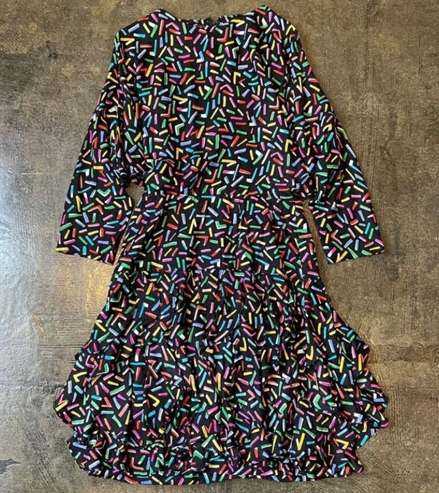 クラッカーを鳴らした後の紙吹雪のようなpopな柄が可愛い80年代のシルクドレスです。 ドルマンスリーブで裾は段々のフリル❤︎ フルハウスのキミーがパーティーに着て行きそうなワンピースですよね! 韓国製 シルク100% サイズ表記10 【実寸】 肩幅・身幅 ドルマンスリーブの為計測不可 着丈(首後ろ付け根〜裾) 約96㎝ 裄丈(首付け根〜袖) 約60㎝ 〜商品の返品について〜 当店はアメリカやヨーロッパを中心とした古着を扱っております。 原則、返品交換には応じかねますのでご了承ください。 一見してわかるようなダメージや汚れにつきましては、画像や説明文でお伝えしておりますが、極小なものやUSEDの範囲内と判断した細かなものについては省略させて頂く場合がございます。 また、古着ですので目に見えない経年変化や生地の退化などがある場合がございます。 USED品であることをご理解頂いた上、お買い求めくださいますようお願い申し上げます。