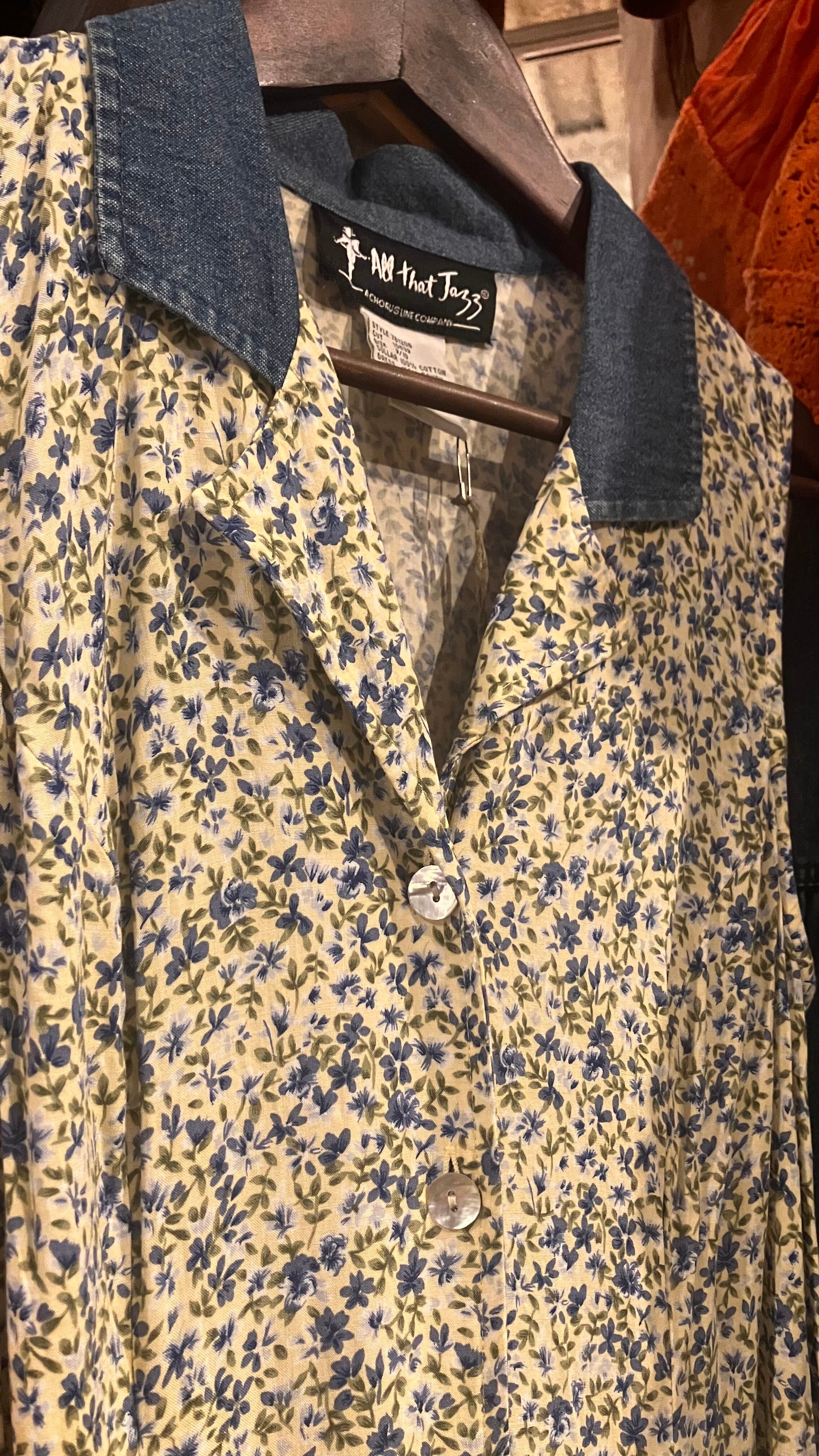 お花の色を拾った襟のデニム切り替えと、小さめのシェルボタンがポイント。
