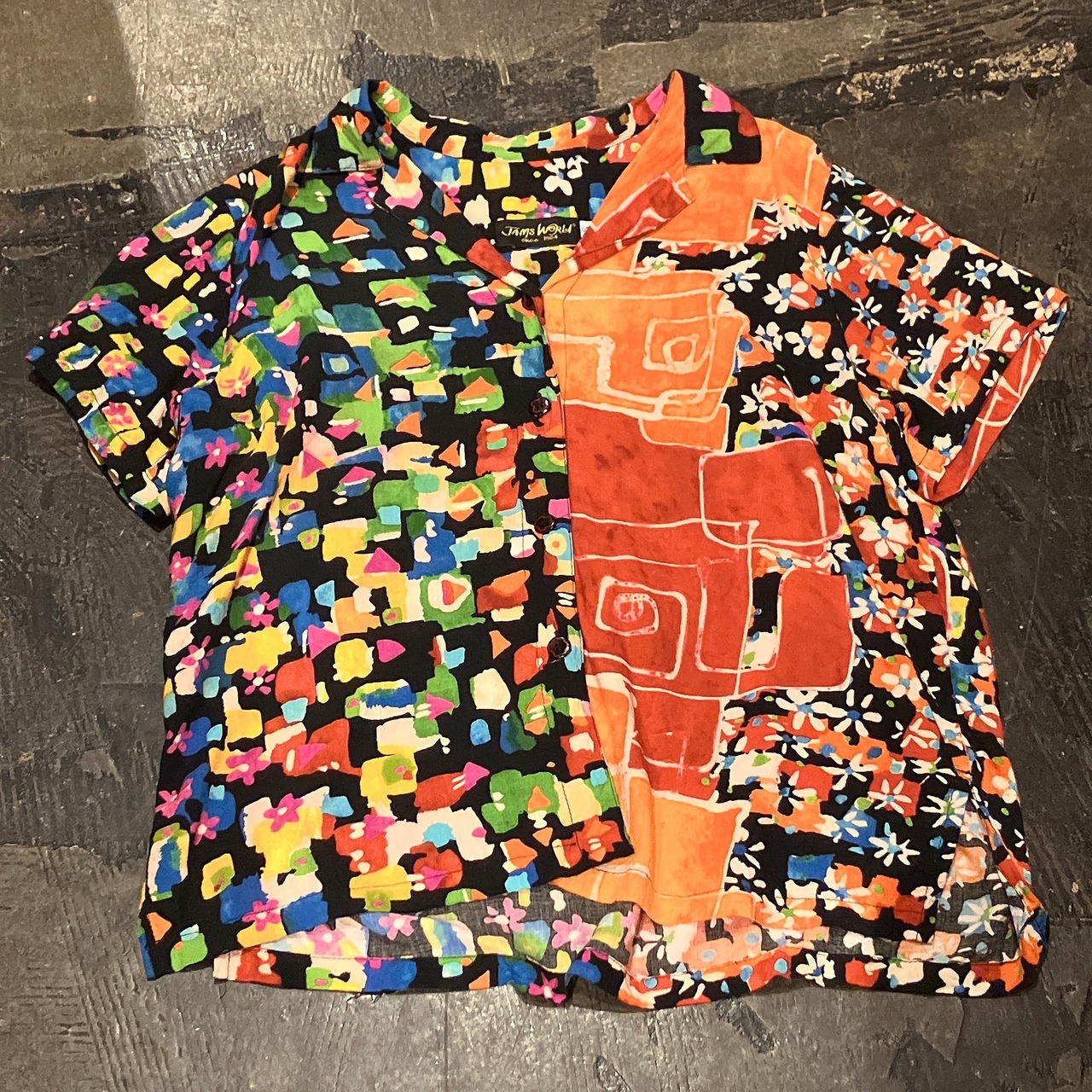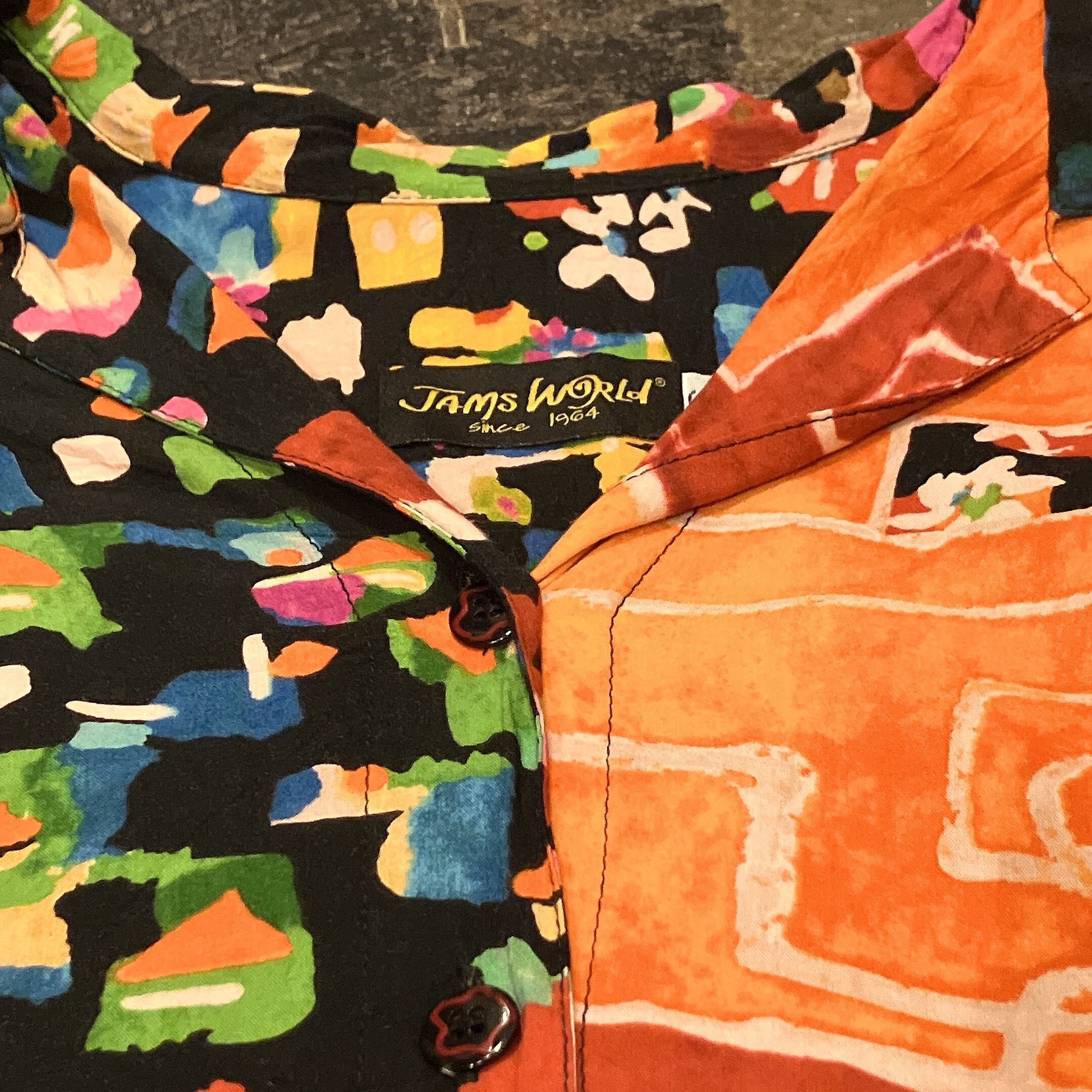 アシンメトリーな総柄のジャムズワールドのアロハシャツ。