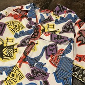 謎クリーチャー柄のオープンカラーシャツ。