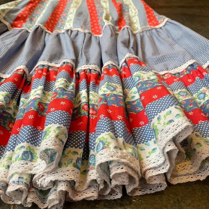 小花柄とピンドットのパッチワークのティアードスカートです。