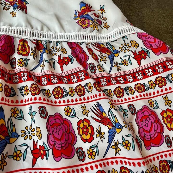 孔雀や燕、お花がプリントされたフィッシュテールスカート。