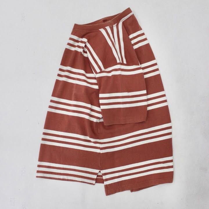 肌馴染みの良いくすみオレンジにホワイトのボーダーで程よく爽やか。