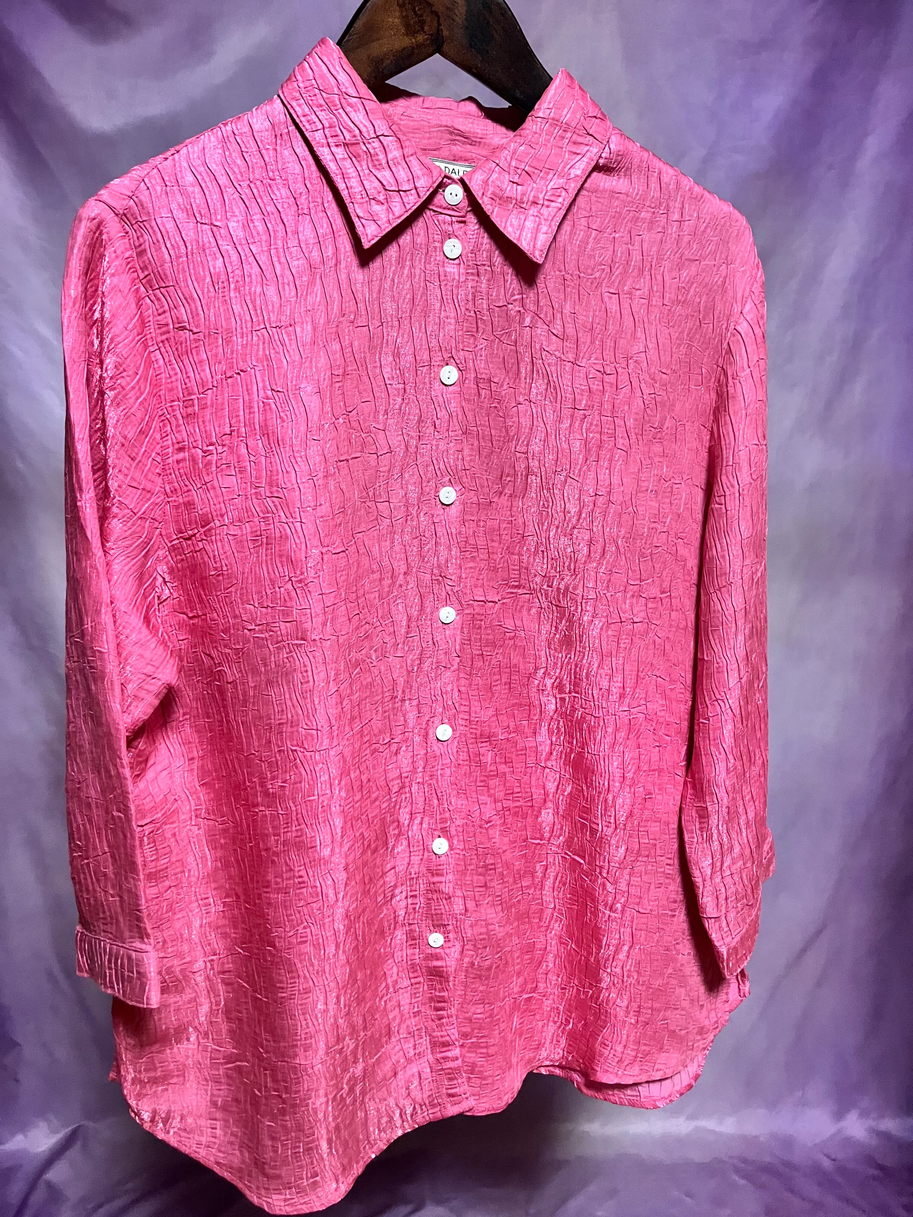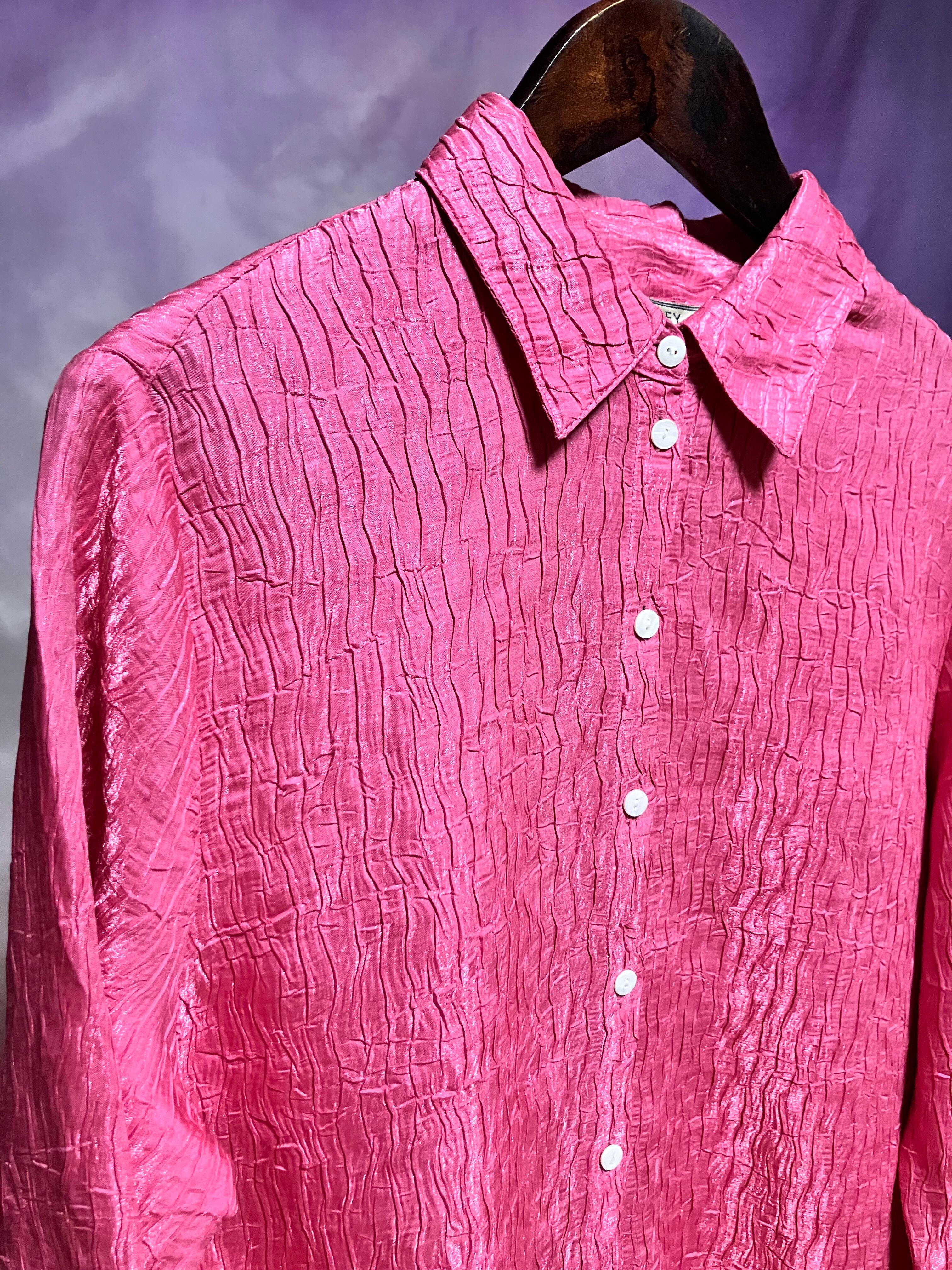 ビビッドなピンクカラーのシワ加工シャツ。