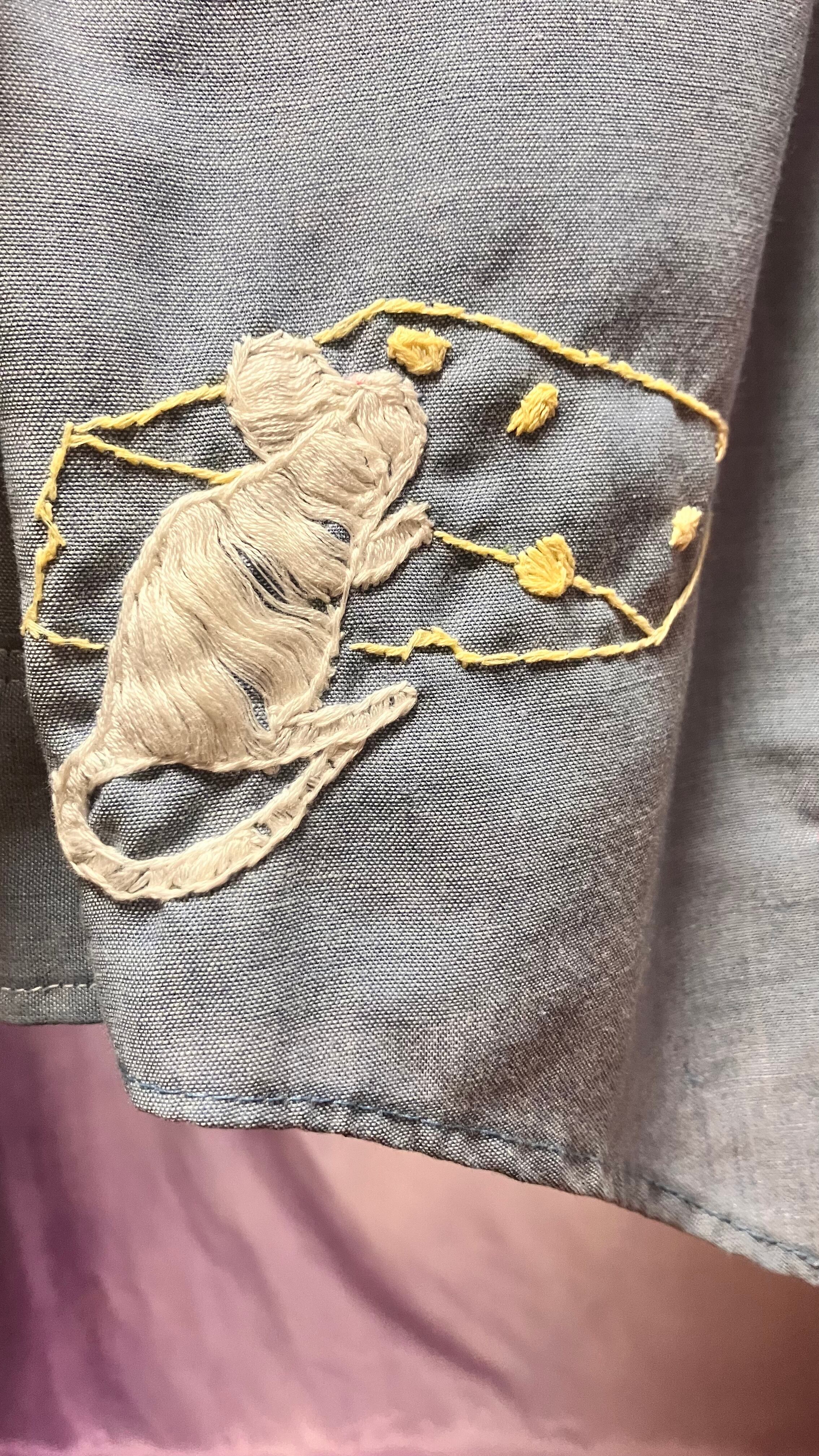 インディアン帽子や謎の生物などネイティブっぽいモチーフのもの、はたまた椰子の木などの南国ぽいモチーフがあると思えばチーズをかじるネズミがいたり、、シロクマだったり、、統一性があるようで無いこの刺繍が愛らしい。