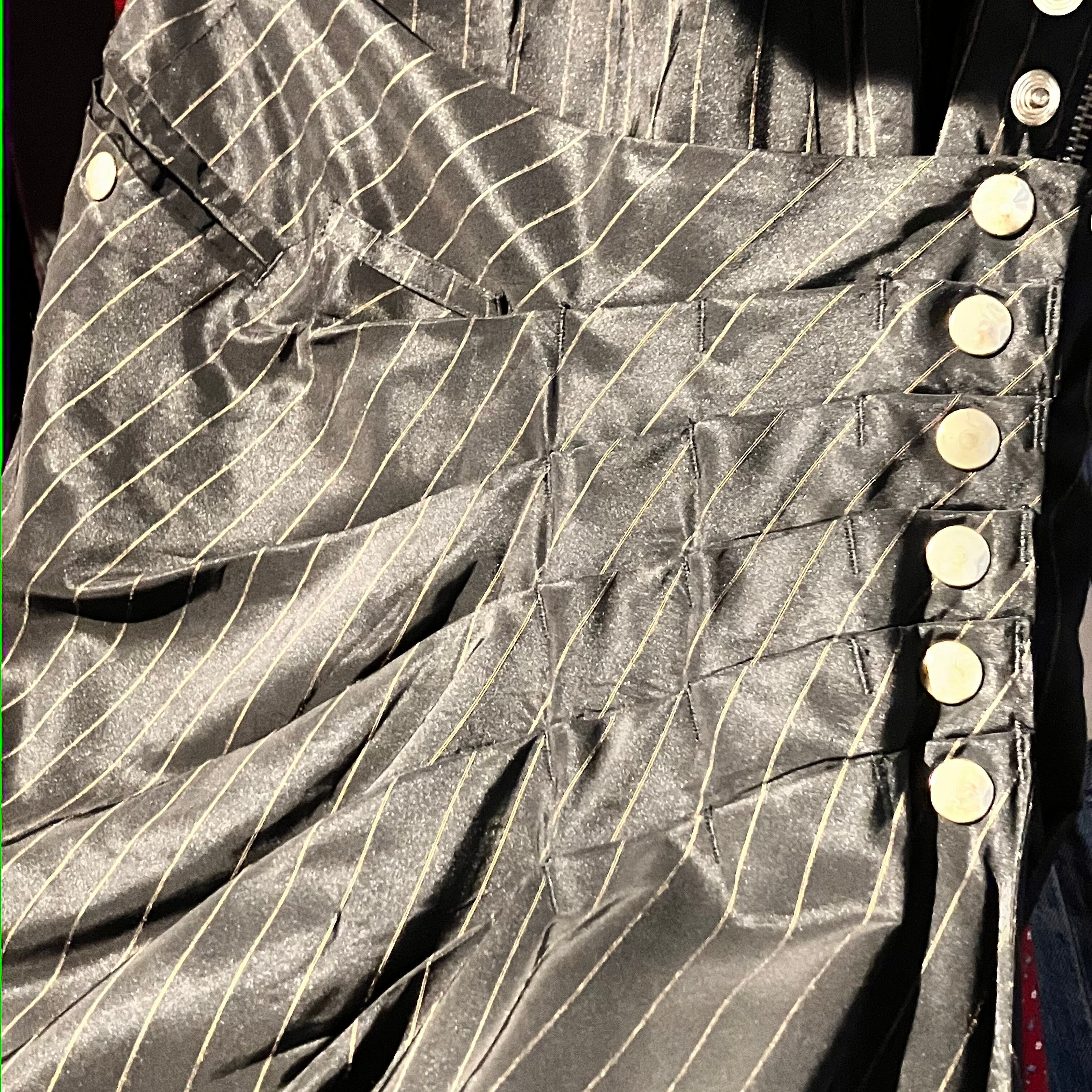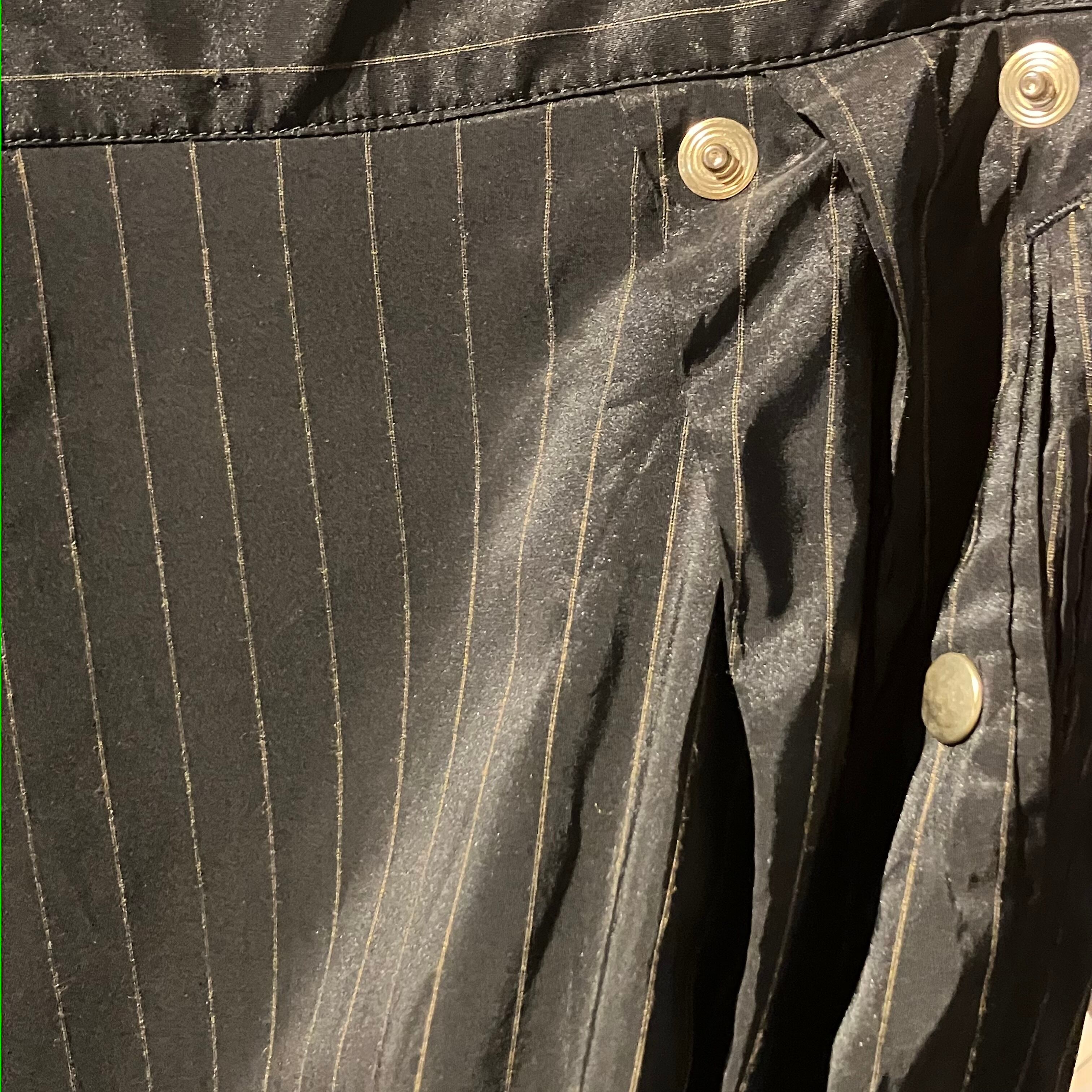 裾の斜めのカットやポケットの異様な位置、そこに?という場所に散らばるスナップボタンなどなど、面白い仕掛けが沢山あります。